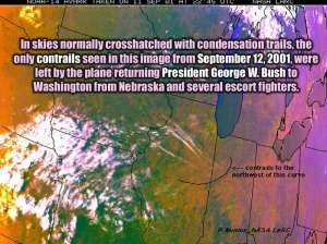 - September 11, 2001 all planes were grounded and scientists observed contrails fanning out to cover the sky. Their results were shocking to the scientific community showing contrail cirrus clouds were affecting the daily temperature range. Later in 2008 a volcanic eruption lead the observation of a single E3 AWACS plane covering all of the UK with clouds, leading to the conclusion that contrail cirrus may be affecting the climate 5000 times more than aviation CO2!