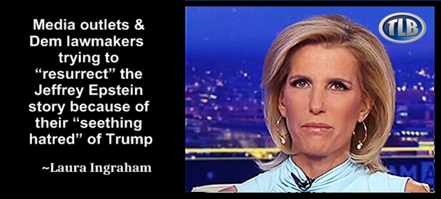 Fox News host Laura Ingraham said Friday on “The Ingraham Angle” that media outlets and Democratic lawmakers were trying to “resurrect” the Jeffrey Epstein story because of their “seething hatred” of President Donald Trump.