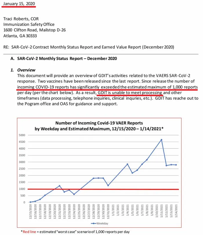 As you can see from page 8 of the pdf, General Dynamics warned the CDC that VAERS had blown through the expected 1,000 cases per day and even reached a level above 4,500 – to the point that GD couldn’t process the data. Mind you, they were never concerned with the human toll, just the logistics of the contract labor. They predicted a need for “reforecasting of staffing needs” to process all these reports.