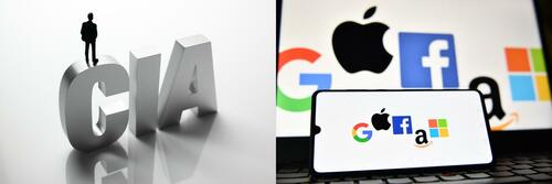 Header featured image (edited) credit: (l) An illustration of the CIA logo (Getty Images); (r) An illustration shows the logos of Google, Apple, Facebook, Amazon and Microsoft displayed on a laptop screen. (Photo by JUSTIN TALLIS / AFP)