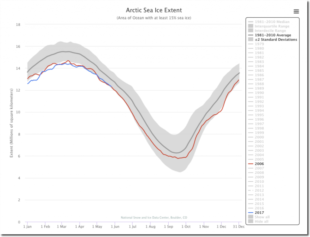 2006 was the year with the highest summer minimum of the last 12 years, and current sea ice extent is identical to this date in 2006