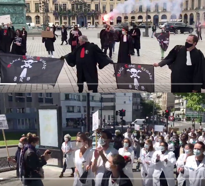 The RT article then goes on to list certain protests around France from May 10-12 & 14, which taken as a whole, show small groups of diverse people, including the Yellow Vests, protesting the health emergency, recognizing the illegality of the lockdown (a recurrent theme of lockdowns in all our countries), &etc. This includes a group of lawyers calling themselves “Black Robes” protesting the violation of citizens’ rights (see image), and healthcare workers angry against the government (see image).