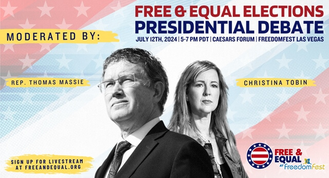 Tune into the live broadcast of the Free & Equal Presidential Debate @ FreedomFest, moderated by Congressman Thomas Massie and Christina Tobin, from Caesars Forum in Las Vegas, NV, Friday, July 12th from 8-10 PM EDT/5-7 PM PDT. This event marks a critical moment in the lead-up to the 2024 Presidential election, spotlighting a diverse range of candidates. Public voting opens on the Free & Equal Election Assistant Blockchain Beta Application powered by Nexus.io after the debate to pick the debate winner.