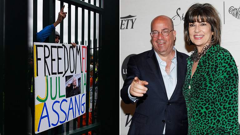 Protests against extradition of Julian Assange (left); CNN president Jeff Zucker and anchor Christiane Amanpour (right) © Getty Images / Peter Summers; REUTERS/Shannon Stapleton