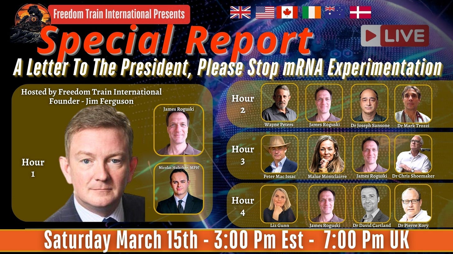 The event is hosted by Jim Ferguson and James Roguski. It begins at 3PM Eastern, Noon Pacific time Saturday 3/15/2025. I will participate in the second hour, 4PM Eastern, 1 PM Pacific. There are many featured speakers and activists including: James Roguski, Nicholas Hulscher, Wayne Peters, Dr. Joseph Sansone, Dr. Mark Trozzi, Peter Mac Issac, Malue Montclaire, Dr. Chris Shoemaker, Liz Gunn, Dr. David Cartland, and Dr. Pierre Kory.