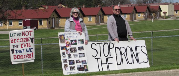 In a nonviolent action to draw attention to the horror of drone murders, US grandmother Joy First was one of four nonviolent activists arrested at the Wisconsin Air National Guard Base (Volk Field) during one of the monthly vigils (held for over five years now) by Wisconsin Coalition to Ground the Drones and End the Wars. Volk Field is a critical component of the drone warfare program being conducted by the US government in a number of countries in the Middle East and Africa. At Volk Field personnel are trained to operate the RQ-7 Shadow Drone, which has been used for reconnaissance, surveillance, and target acquisition. You can read more about drone warfare and resistance to it in Joy’s highly informative article ‘Four Citizen Activists Arrested at Volk Field as they Attempt to Identify the Base as a Crime Scene’.