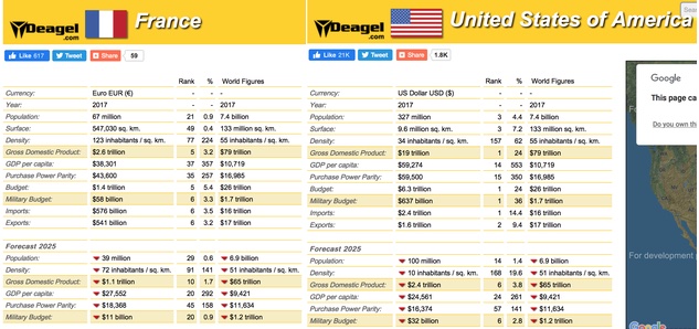 ER Editor: In the context of this topic, we remind readers of a particularly scary set of data that has gone the rounds on social media. The deagel.com site (search for ‘deagel population forecast 2025’, then click on the desired listed country to get detailed population sizes and drastically reduced projected population estimates) has published dramatically reduced population projections for many Western countries by the year 2025 (not China and India, listed first, however, and others such as Russia, etc.). Who is behind this? What is the intention? Here are the projections for France and the USA: