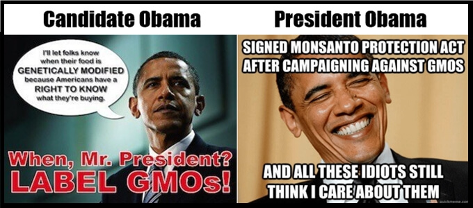 This was the same president who appointed a Monsanto VP as his Czar to the FDA (a HUGE red flag and conflict of interest), a Supreme Court Judge and ex-lawyer of Monsanto rules in their favor 100% of the time with not even recusing himself once (another huge conflict of interest).