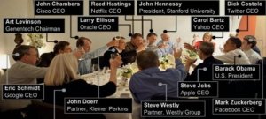 Many of these attendees were members of TechNet. This 14 year old technology lobbying group was founded in the Silicon Valley. An advocacy group for high-tech CEOs, their names included, Carol Bartz, president and CEO, Yahoo, John Chambers, CEO and chairman, Cisco Systems, Dick Costolo, CEO Twitter, John Doerr, partner, Kleiner Perkins Caufield & Byers, Larry Ellison, co-founder and CEO, Oracle, Reed Hastings, CEO, Netflix, John Hennessy, president Stanford University, Steve Jobs, chairman and CEO, Apple, Art Levinson, Chairman and former CEO, Genentech, Eric Schmidt, Chairman and CEO, Google, Steve Westly, managing partner and founder, The Westly Group, Mark Zuckerberg, founder, president and CEO, Facebook.