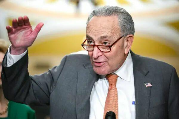 Senate Majority Leader Chuck Schumer (D-N.Y.) speaks to the press after the Democratic Party’s weekly luncheon at the U.S. Capitol, on March 6, 2024. (Mandel Ngan/AFP via Getty Images)