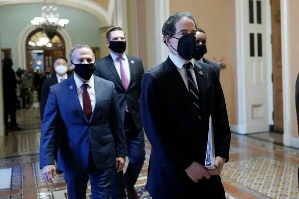 Democratic House impeachment managers, led by Rep. Jamie Raskin (D-Md.), walk out of the Senate Chamber in the Capitol, on Feb. 13, 2021. (J. Scott Applewhite/AP Photo)