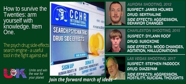 Here is an valuable tool for anyone who wants to know the full scoop about any of the psych meds the psychiatrists and Big Pharma are pushing in an effort to drug the entire population to destruction. Provided by our friends of the Citizens Commission on Human Rights (CCHR) as a public service, it gives you far more thorough and reliable information than you are likely to get from your doctor or psychiatrist.