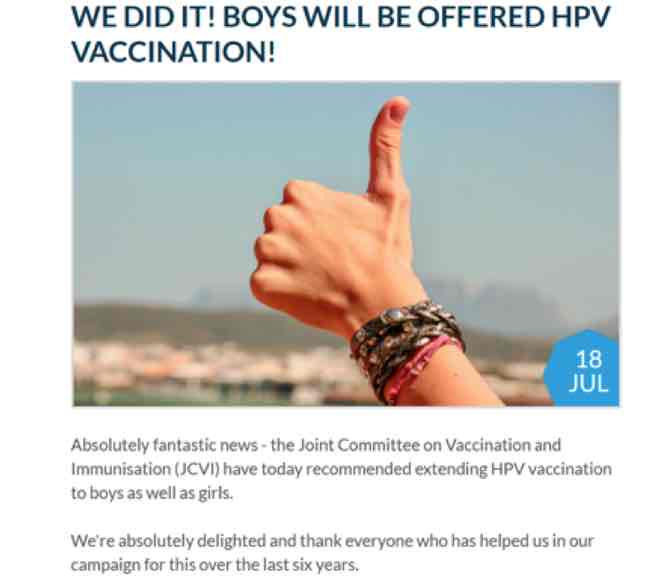 The result of the pressure groups helped to persuade the JCVI to change its model, such that its previous recommendation to not advise the UK government to adopt the HPV vaccine for boys was changed to advise the introduction of that vaccine onto the UK vaccine schedule.