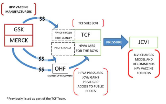 There is no mistaking the aim of those groups: target the JCVI. As the diagram clearly shows (see below POSSIBLE CONFLICTS OF INTEREST IN HPV VACCINE PRESSURE GROUPS), that’s just what they did.