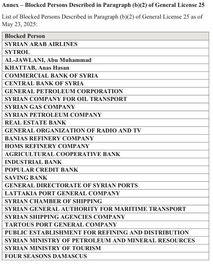 The Treasury Department confirmed that it has issued General License 25 (GL25), authorizing previously prohibited transactions under the Syrian Sanctions Regulations (SSR), and further Rubio issued a 180-day waiver of the Caesar Syria Civilian Protection Act, suspending some of the harshest measures passed by Congress in 2019.