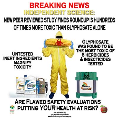A new study shows GMO food treated with Roundup herbicide is up to 1000 times more toxic (100,000%) than Monsanto claims, because Monsanto doesn’t include the toxicity of so-called inert ingredients, which this new study shows are extremely toxic themselves.