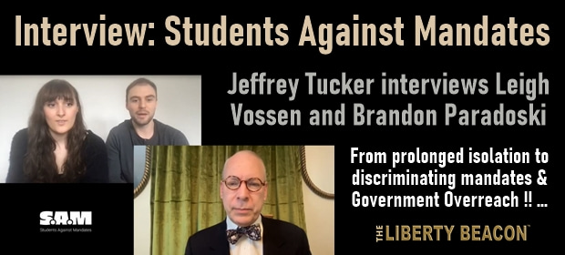 Leigh Vossen, President & Founder and Brandon Paradoski, VP & Head of Science at Students Against Mandates join with Jeffrey Tucker to discuss the lockdown and mandate trauma of the past two years. From prolonged isolation to discriminating mandates, government overreach to infringement on student and human rights, and what steps the organization is taking to fight back.
