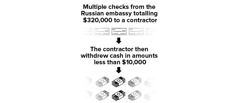 Bankers flagged to the Treasury Department’s financial crimes unit about 600 payments from the Russian Embassy to this contractor’s companies. The bankers found that those transactions did not appear connected to the presidential campaign but that they were suspicious for other reasons. For example, a company controlled by the contractor received multiple checks from the Russian Embassy for a total of about $320,000; he then withdrew cash in amounts below the level that would have triggered an alert to government watchdogs.
