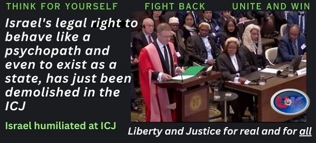 And just to add to Israel’s woes, its legal right to behave like a psychopath and even to exist as a state, has just been demolished in the ICJ as shown in the video below and the very able video commentary and article that follow it.