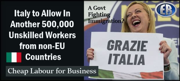 L’Italia rilascerà circa 500.000 nuovi visti di lavoro per cittadini extracomunitari dal 2026 al 2028 per ampliare i “canali di immigrazione legale”, adducendo come motivazione la “carenza di manodopera”.