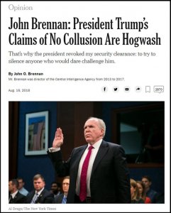 Brennan – the former director of the CIA– was so convinced of Trump’s collusion that he penned an angry Op-Ed in the New York Times after his security clearance was revoked, titled: “President Trump’s Claims of No Collusion Are Hogwash.”