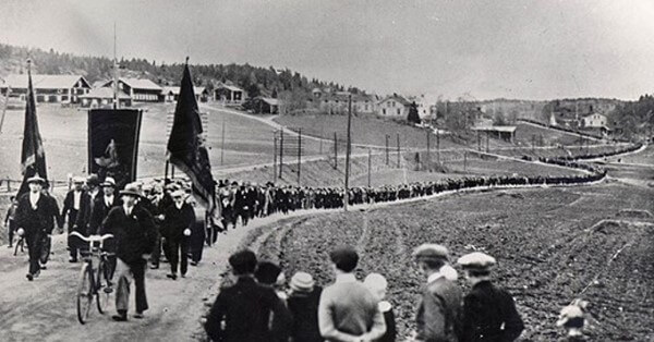The Depression hit bottom in 1931. More people were jobless there than in any other Nordic country. Unlike in the U.S., the Norwegian union movement kept the people thrown out of work as members, even though they couldn’t pay dues. This decision paid off in mass mobilizations. When the employers’ federation locked employees out of the factories to try to force a reduction of wages, the workers fought back with massive demonstrations.