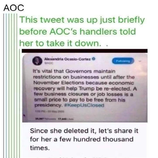 If you think any of the above indicators of Liberal/Progressive/Democrat tyranny against We The People is just plain bullsh*t … let this tweet by Radical Dem AOC sink in a little as you and your family’s lives slowly fade to black …