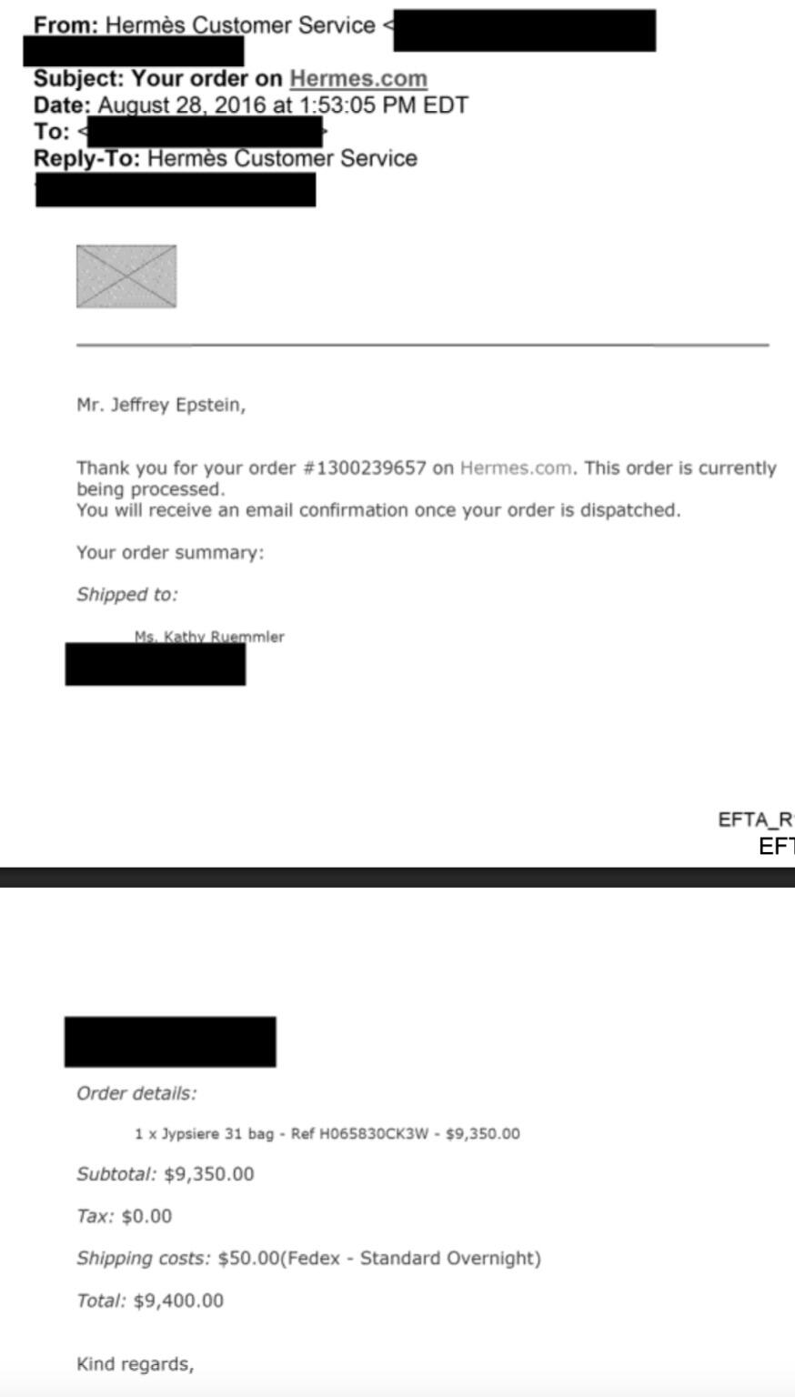 The priciest gift likely came in August 2016, when Epstein purchased Ruemmler a $9,400 handbag from the French luxury brand Hermes. Epstein took a particular interest in ensuring Ruemmler received the bag, directing one of his associates, Lesley Groff, to “confirm receipt with Kathy” and “follow up to make sure it happens.” When Ruemmler received the bag, she wrote to Groff, “OH MY GOD!!!!! He is in so much trouble!!!! I am dying. It is so beautiful,” as Groff relayed to Epstein. Used versions of the same bag—a Jypsiere 31—now sell for around $5,000.