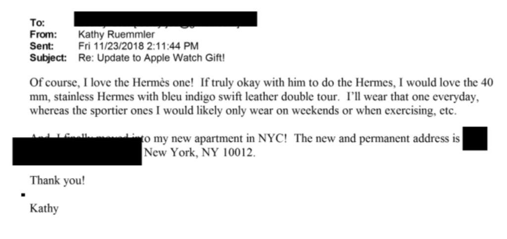 “If truly okay with him to do the Hermes, I would love the 40 mm, stainless Hermes with bleu indigo swift leather double tour,” she wrote at the time. “I’ll wear that one every day, whereas the sportier ones I would likely only wear on weekends or when exercising, etc.”