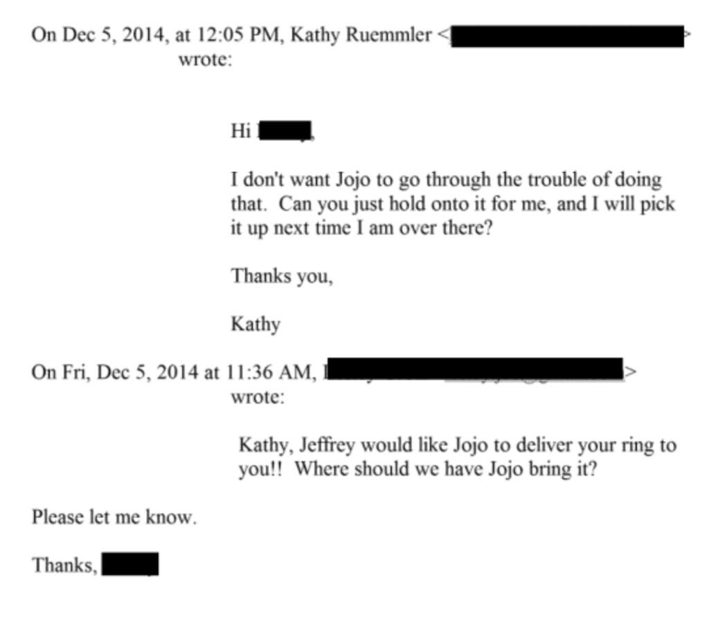 Epstein appeared to provide other gifts of unknown value to Ruemmler. In December 2014, an Epstein associate emailed Ruemmler to inform her that Epstein planned to send his housekeeper to “deliver your ring to you!!” In February 2019, an Epstein associate sent a reminder email to an unidentified individual reading, “Reminder: Bottle of wine and note card to be delivered to Ruemmler today. Let me know once it has been delivered so I can tell Jeffrey.”