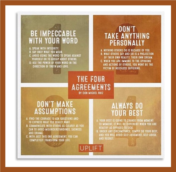 THE FOUR AGREEMENTS (from Don Miguel Ruiz) are next up, a reminder of what YOURS TRULY needs to address in his life, and oh, what a share!