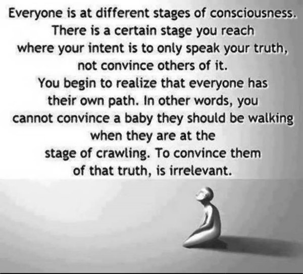 The Next Level, if you will, in Consciousness, call it what you will… BUT… We all need to remember, to Honor and to Respect the fact that each one of us grows at his or her own pace, understanding and realization of our own growth in our own time… just like you can’t tell a baby to get up and walk when it is at the crawling stage…