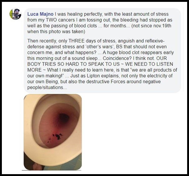 Not since November had I experienced this, and today, it is back… after about three or four days of FIGHTING OFF the destructive forces of confrontational anxieties… Last time this happened to me, I developed a huge pocket of water on the inside of my left knee… the left knee, the one closest to the heart… stress… emotional trauma… Does it every time… and then while I am reading this and watching the video, Lipton himself says (as if it were meant for me, and for those of you following this series):