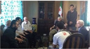 In the image above: U.S. Senator John McCain meeting illegally in a rebel safe house with the heads of the “Free Syrian Army” in Idlib, Syria in April, 2013. In the left foreground, top al Qaeda terrorist leader Ibrahim al-Badri (aka Al-Baghdadi of ISIS, aka Caliph Ibrahim of the recently founded Islamic Empire) with whom the Senator is talking. Behind Badri is visible Brigadier General Salim Idris (with glasses), the former military chief of the FSA, who has since fled to the Gulf states after the collapse of any semblance of the FSA. (Courtesy VoltaireNet.org)