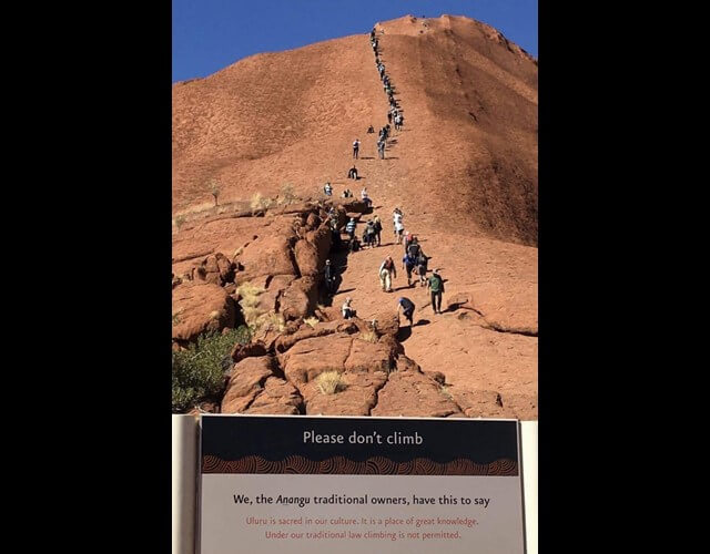 A whole line of climbers is seen disregarding an Indigenous plea not to climb.