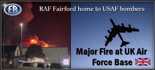 ER Editor: RAF Fairford in Gloucestershire appears to have been a base for US bombers, according to the visuals being put out, and now there’s been a major fire there in the wee hours of Sunday morning. The war narrative, entirely dubious in our opinion, keeps on chugging, via a fire that should be nothing but is appearing as something in the media.