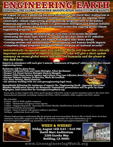 On Friday, August 14th, 2015 a gathering has been scheduled at the David Marr Auditorium In Redding, California (seating for over 1000) to present indisputable evidence to the public on the ongoing covert catastrophic climate engineering/geoengineering programs. This is a FREE public education event, there is no admission fee. Numerous experts including former government biologists and defense industry personnel will present data to conclusively prove that the ongoing climate engineering programs are: