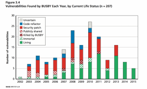 Rand’s researchers found that there was no pattern around which exploits lived a long or short life — severe vulnerabilities were not more likely to be fixed quickly than minor ones, nor were vulnerabilities in programs that were more widely available.