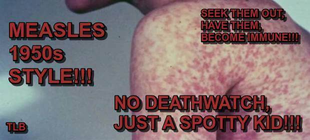 I challenge people to buck the system by eating organic food when possible and to actively work to find the measles and other childhood illnesses for their families and to keep them going! Trading mild illness for the unspeakable is unacceptable to me and it high time we stop worrying what the pro vaxxers think and start fighting for the health of humanity! (CW)
