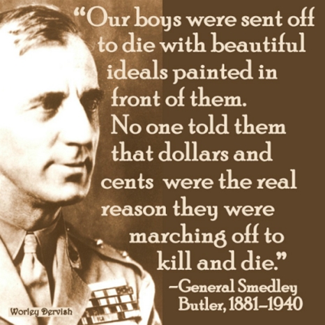 Memorial Day commemorates soldiers killed in war. We are told that the war dead died for us and our freedom. US Marine General Smedley Butler challenged this view. He said that our soldiers died for the profits of the bankers, Wall Street, Standard Oil, and the United Fruit Company. Here is an excerpt from a speech that he gave in 1933: