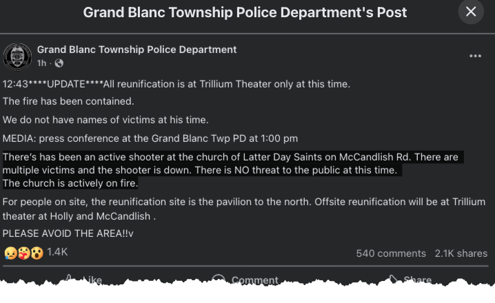 The Grand Blanc Township Police Department provided more details about the situation in a Facebook post, stating: “There has been an active shooter at the Church of Jesus Christ of Latter-day Saints on McCandlish Road. There are multiple victims and the shooter is down. There is no threat to the public at this time. The church is actively on fire.”
