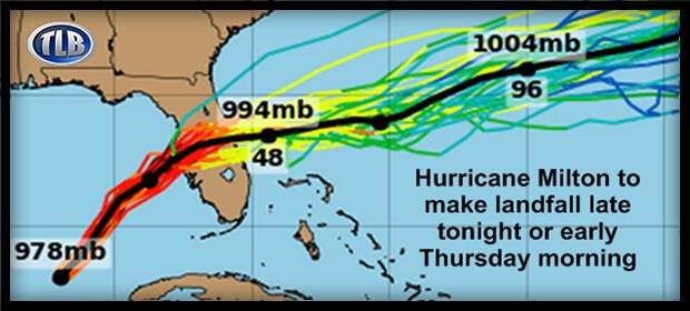 (Tyler Durden Reports) – Milton strengthened overnight into a devastating Category 5 hurricane with maximum sustained winds in excess of 160 mph. The National Hurricane Center reported early Wednseday that Milton was located about 300 miles southwest of Tampa, traversing the warm waters of the Gulf of Mexico towards the northeast at 14 mph.