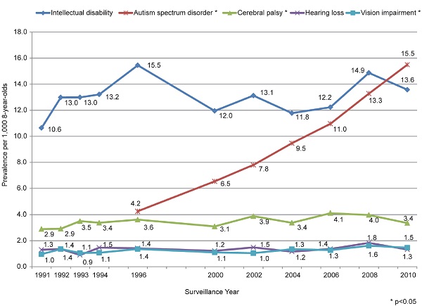 Meanwhile, in the realm of real science, autism rates have skyrocketed 296% over the last few years as the vaccine push has grown more aggressive. See the rising rate depicted in the red line of the bar chart below, as shown in the newly published study: “Trends in the Prevalence of Autism Spectrum Disorder, Cerebral Palsy, Hearing Loss, Intellectual Disability, and Vision Impairment, Metropolitan Atlanta, 1991 — 2010.”