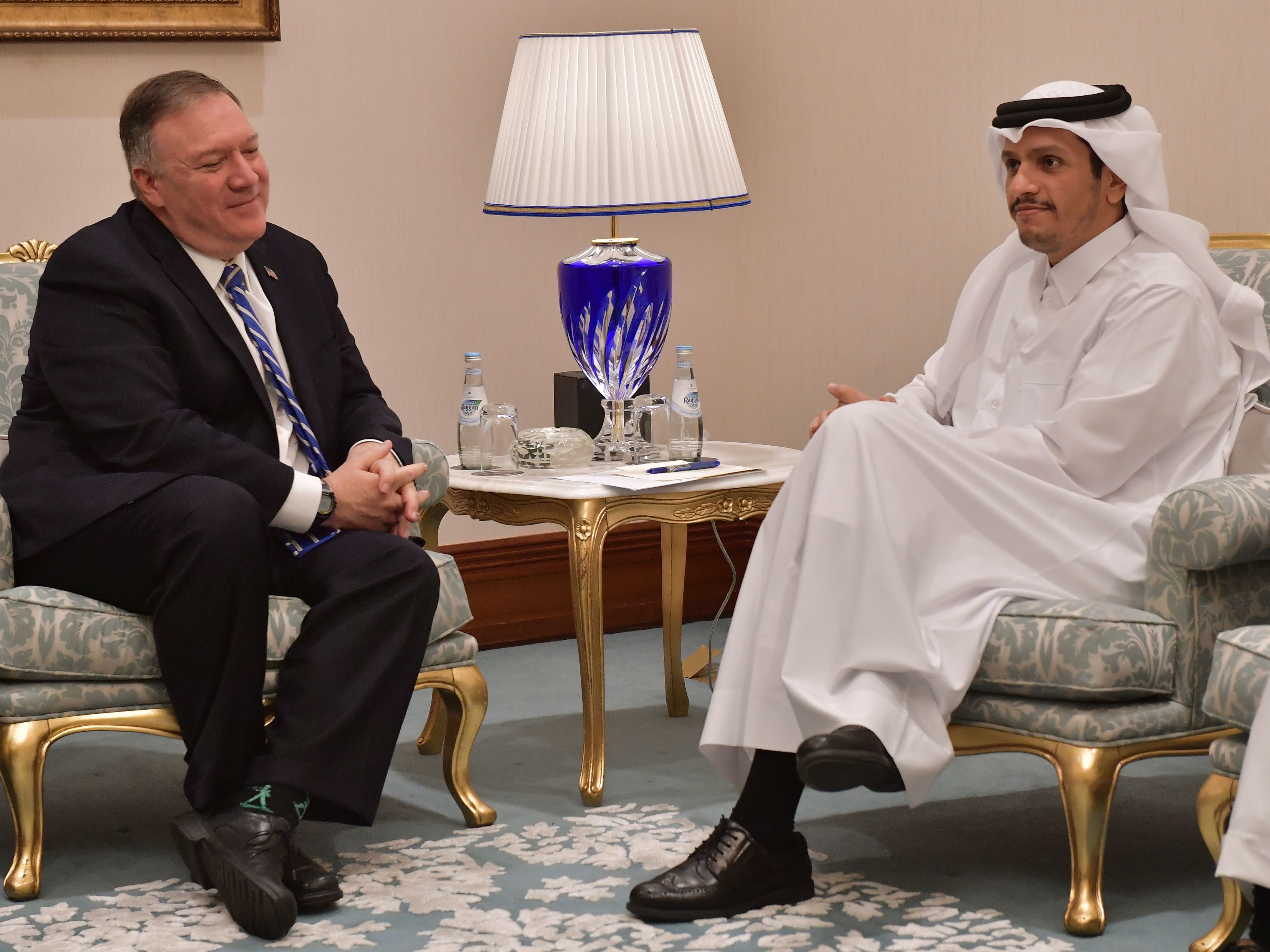 Secretary of State Mike Pompeo, left, meets with Qatari Deputy Prime Minister and Minister of Foreign Affairs Sheikh Mohammed bin Abdulrahman al-Thani ahead of Saturday’s signing ceremony between the U.S. and the Taliban in Qatar’s capital, Doha. Image: Giuseppe Cacace/AFP via Getty Images