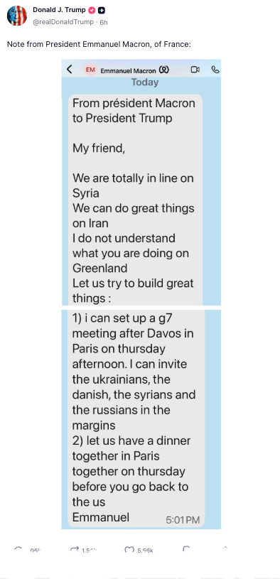Trump posted what appears to be a private message from Macron on Truth Social, in which the French president wrote, “We are totally in line on Syria. We can do great things on Iran. I do not understand what you are doing on Greenland.”