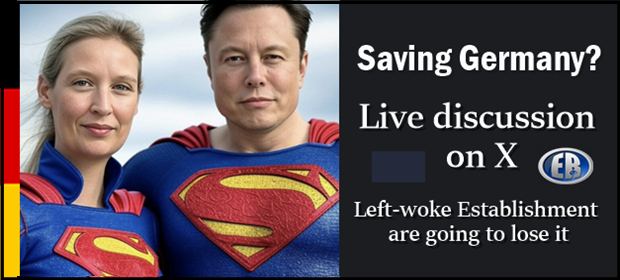 ER Editor: A reminder that Brand Elon is behind Alice Weidel, leader of Germany’s populist right party, the AfD (Alternative fur Deutschland). They are due to have a public debate on X shortly.