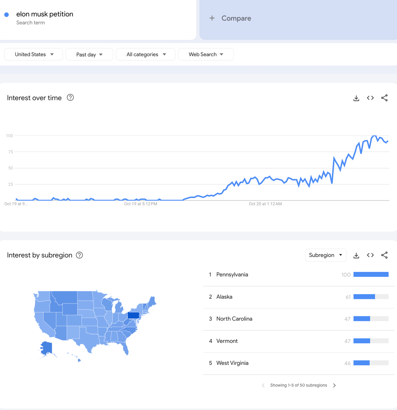 Google Trends data shows that searches for “Elon Musk petition” have surged nationwide.