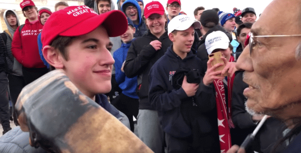 (TLB) Editors note: When we first saw news reports of (what perported to be) an elder Native American, beating on a drum and approaching a group of young people wearing pro-Trump hats at a rally, our thought was… no big deal… everyone is practicing their Constitutional rights. Even as the drum-beating elder singled out one young man wearing a red “Make America Great Again” hat and got right in his face, chanting and beating his drum… again no big deal… the young man smiled and respectively stood his ground. At this point the story simply began to fizzle out, even though we got the feeling someone should be saying “That’s a wrap,” it didn’t happen.