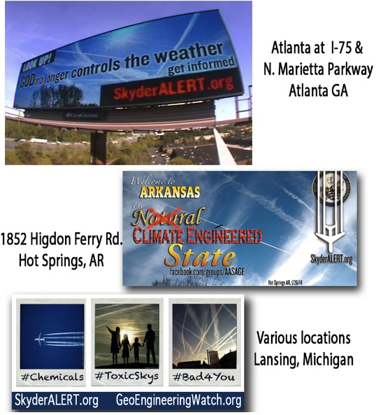 New York, NY, April 21, 2014 — The fight against Climate Engineering (a/k/a GeoEngineering) takes to Clear Channel billboards in Atlanta this week as other cities around the country begin to follow suit to raise awareness about the earth’s largest environmental threat. “Look Up! God No Longer Controls the Weather. Get Informed. www.skyderalert.org