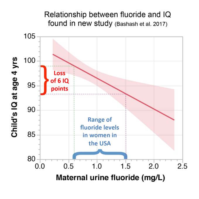 Excerpt from study: In this study, higher levels of maternal urinary fluoride during pregnancy (a proxy for prenatal fluoride exposure) that are in the range of levels of exposure in other general population samples of pregnant women as well as nonpregnant adults were associated with lower scores on tests of cognitive function in the offspring at 4 and 6–12 y old.